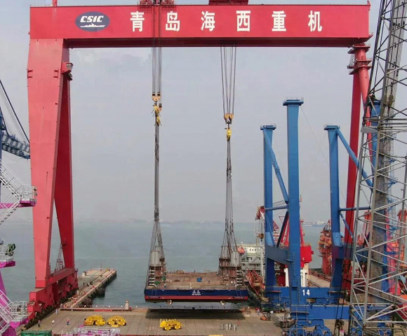 3月31日,中国船舶集团旗下beat365英国官方网站子公司武汉船机海西重机总包承建的华东院306自升式海上勘探平台完成整体吊装下水重大节点。