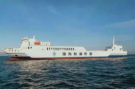 “渤海恒达”轮由我国自主设计建造,总长189.9米,型宽26.4米,设计吃水6米,航速超过17节,续航力最大约5000海里。船舶总吨位2.5万吨,拥有3米宽度的车道线约2700米,可装载大小车辆300余辆,主要运营渤海湾及国内沿海滚装运输业务。