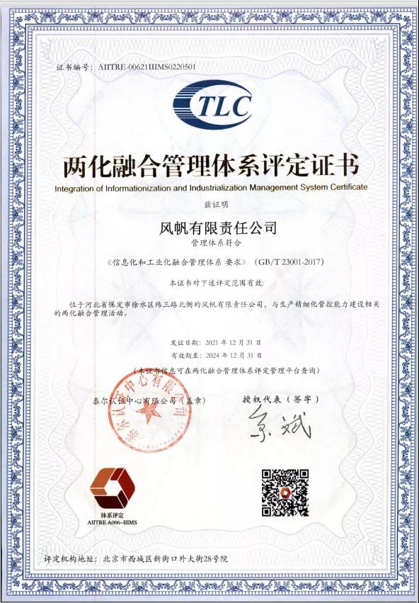 通过两化融合管理体系认证,标志着风帆公司在推进工业化和信息化融合方面取得了新突破,在持续优化管理,深入贯彻融合和创新理念的过程中,风帆公司力争保持可持续竞争优势,强化信息化环境下的新型能力。