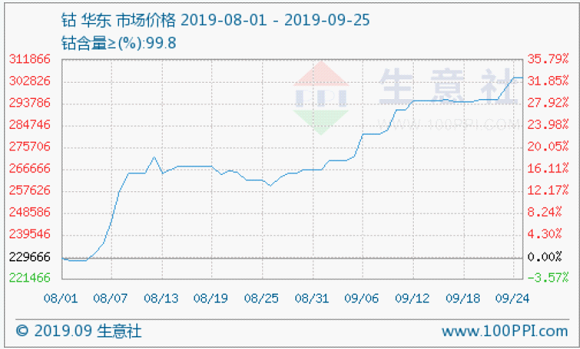 根据生意社数据监测显示:近期国内钴价稳中有升。截止9月25日,钴价报价3043333.34元/吨,较9月10日钴价报价均价291000元/吨,涨幅4.58%。近期钴价受国际钴价上涨影响,稳中有升。