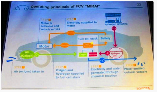 644km,听到这个数字相信很多朋友估计都会有一些小小的激动,毕竟咱们国内续航里程最高的电动车差不多也就四五百公里了,而这台车一来就是600多公里,这着实调动了人们的兴趣。而说到这台丰田Mirai的原理其实也很简单,它利用空气中的氧气(绿色)以及气罐内的氢气(红线)在发电装置内发生反应,产生的电能(橙线)输送给电动机用于驱动车辆,剩余的电能则储存在电池中,用于车辆急加速或为车上的用电设备供电。化学反应之后产生的水(蓝线)直接排除车外即可。