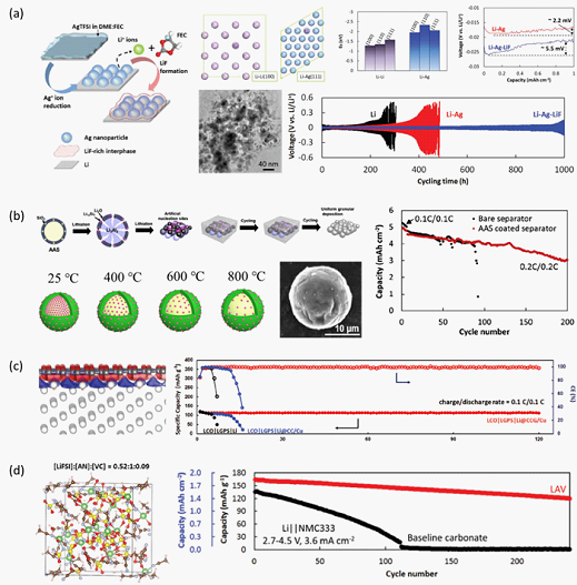 图1 基于(a)银-氟化锂人工界面,(b)富LixAl位点铝基宿主结构和(c)少层石墨烯-三维储锂结构的锂金属负极保护;(d)对锂稳定的新型腈类电解液