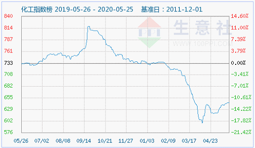 行业方面:5月25日化工指数为644点,与昨日持平,较周期内最高点1016点(2012-03-13)下降了36.61%,较2020年04月08日最低点598点上涨了7.69%。(注:周期指2011-12-01至今)。