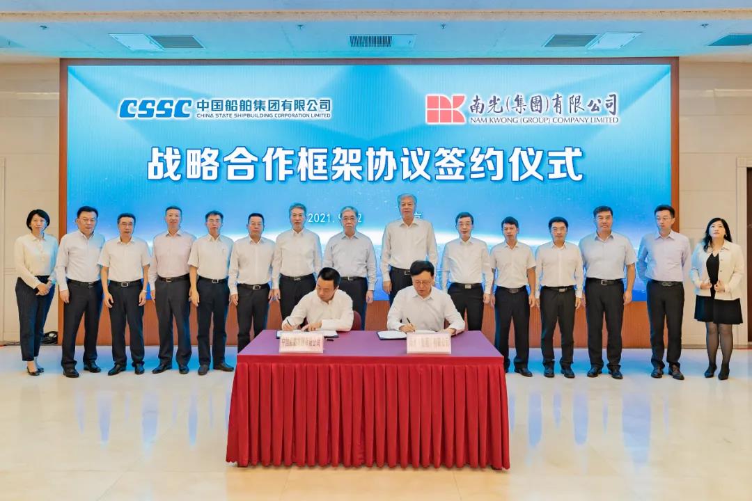 9月22日,中国船舶集团有限公司与南光(集团)有限公司在京签署战略合作框架协议。中国船舶集团党组书记、董事长雷凡培,南光(集团)董事长傅建国出席签约仪式。中国船舶集团党组成员、副总经理盛纪纲,南光(集团)副总经理王彤彦分别代表双方签约。