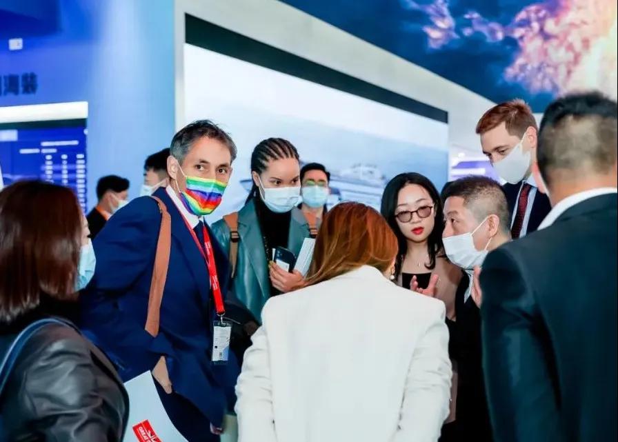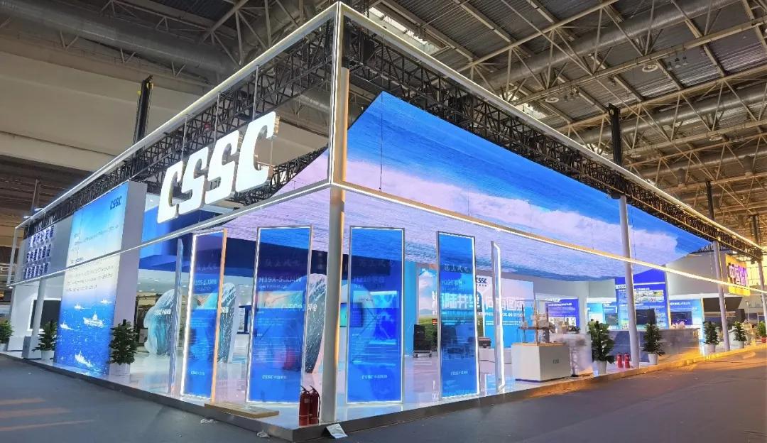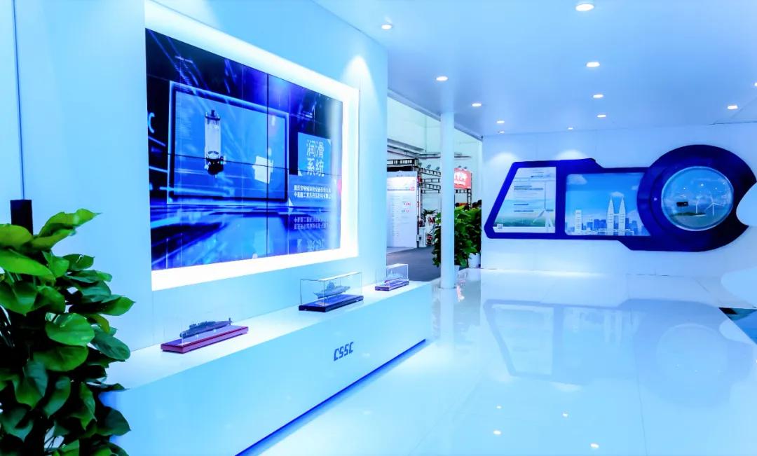 中国船舶集团展台摒弃了“传统色彩矩阵”,用“深海蓝”加 “风机白”打造出大气磅礴的开合式复合空间域,细节上则采用生态为先、大道至简、科技为尚三大设计语言,将“风传送”“海推动”“碳排放”业务生态链条进行了全方位的解构,吸引了众多观展人士驻足。