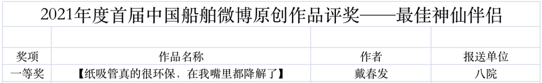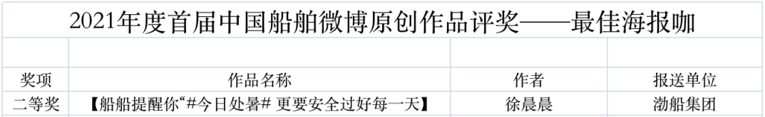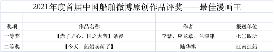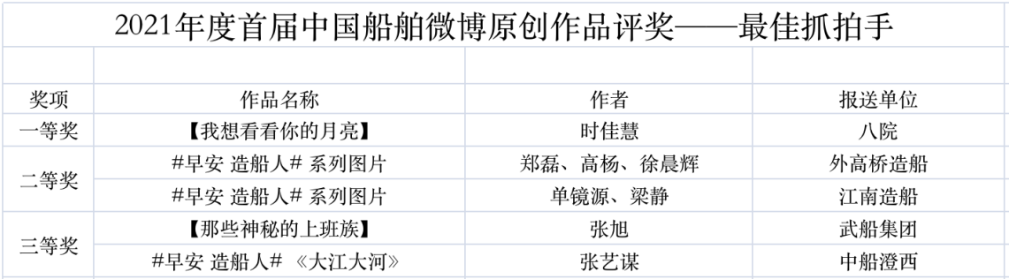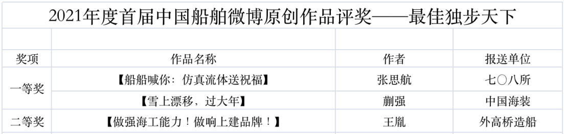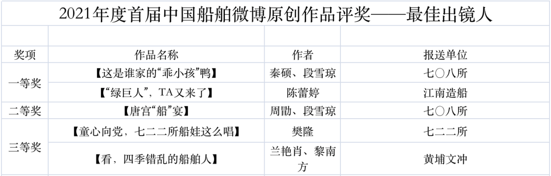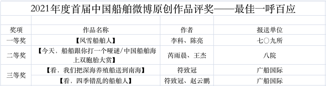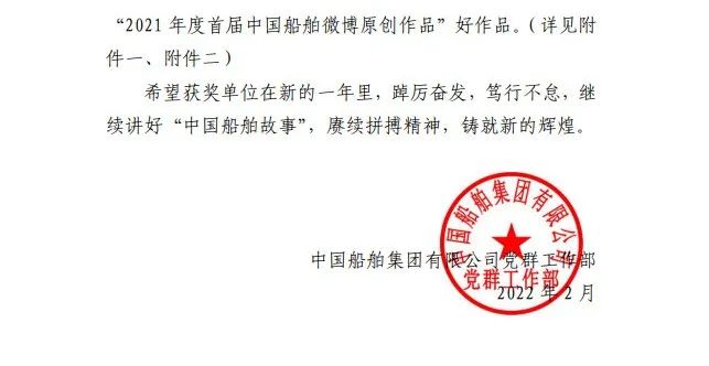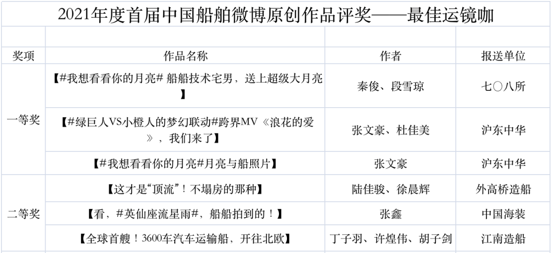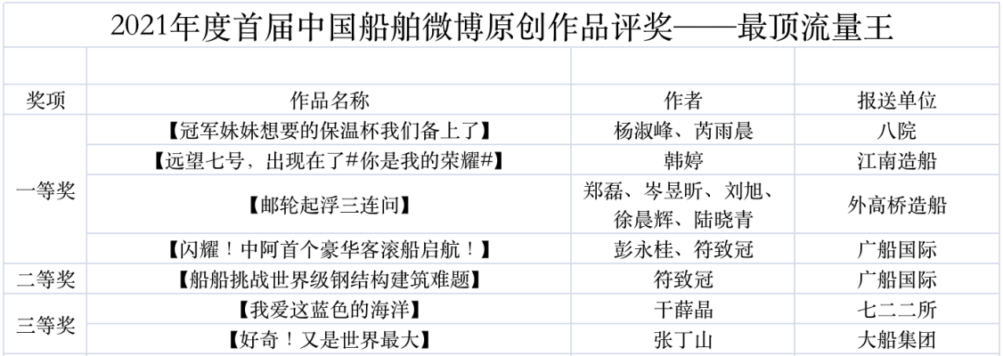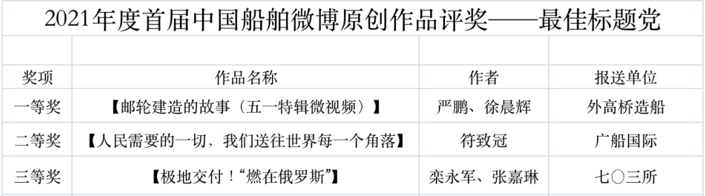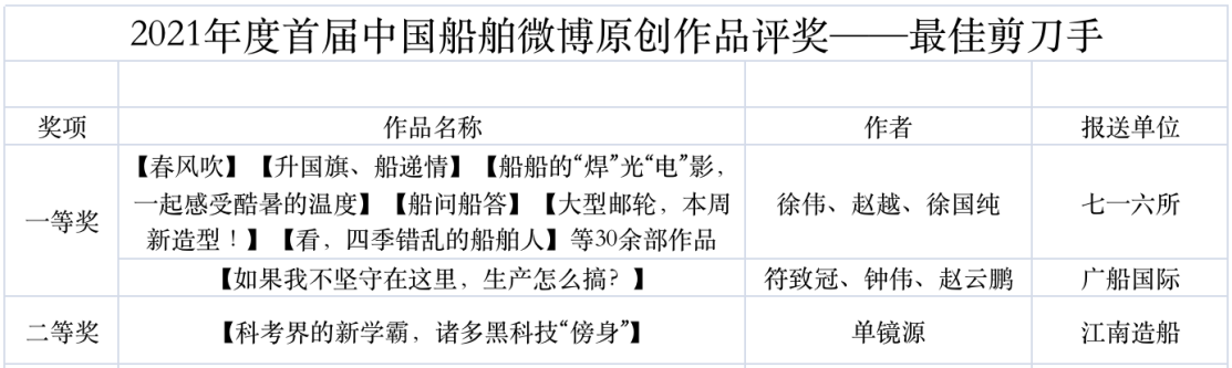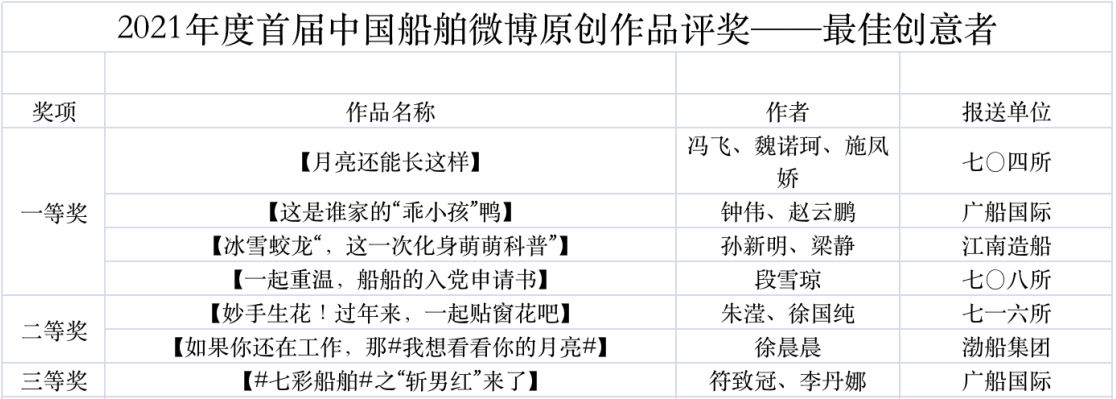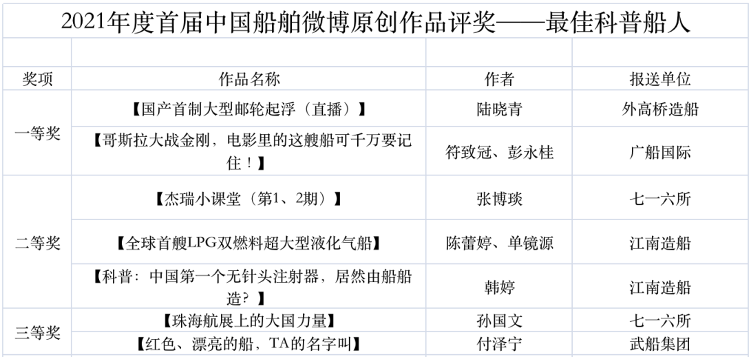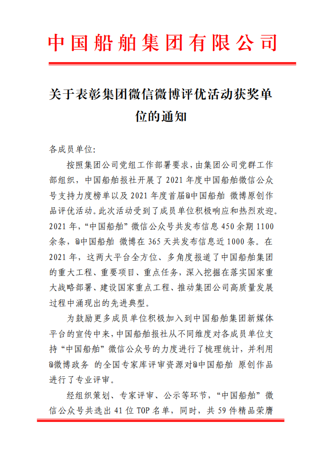 为鼓励更多成员单位积极加入到中国船舶集团新媒体平台的宣传中来,在集团公司党群工作部的指导下,中国船舶报社从不同维度,对2021年度各单位支持“中国船舶”微信的力度进行了梳理统计,并利用微博政务的全国专家库评审资源,对2021年度“中国船舶”微博原创作品进行了专业评审,评选结果公布如下: