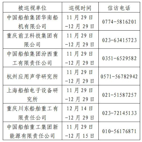 根据中国船舶集团党组2023年第二轮巡视工作部署,截至2023年11月29日,巡视工作已经铺开。其中,对中国船舶集团华南船机有限公司、重庆前卫科技集团有限公司、中国船舶集团汾西重工有限责任公司、杭州应用声学研究所、上海船舶电子设备研究所等5家单位开展常规巡视,对重庆川东船舶重工有限责任公司、中国船舶重工集团新能源有限责任公司等2家单位开展专项巡视。