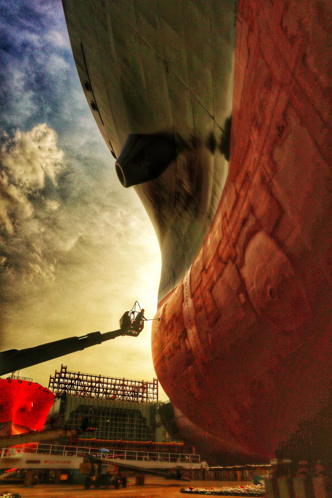 壮丽的船身如山峦一般,余晖映衬下,一位工人正驾驶高空车完成外板清洁施工,构成一幅绝美的画面。