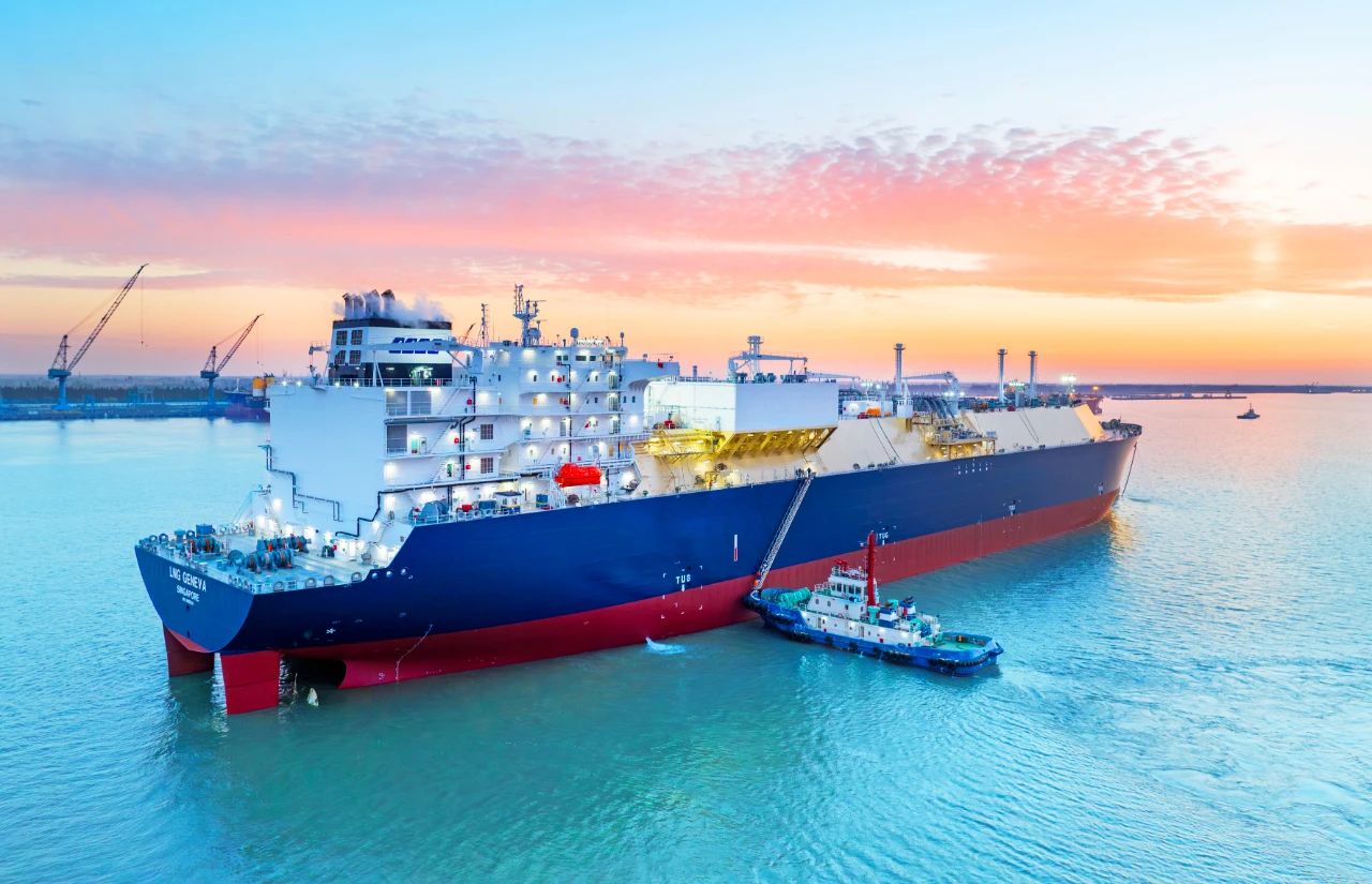 晚霞的天空,碧波的水面,一艘LNG船正航行于天地之间,色彩犹如天成。