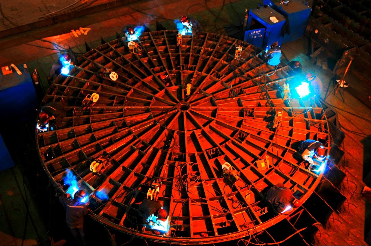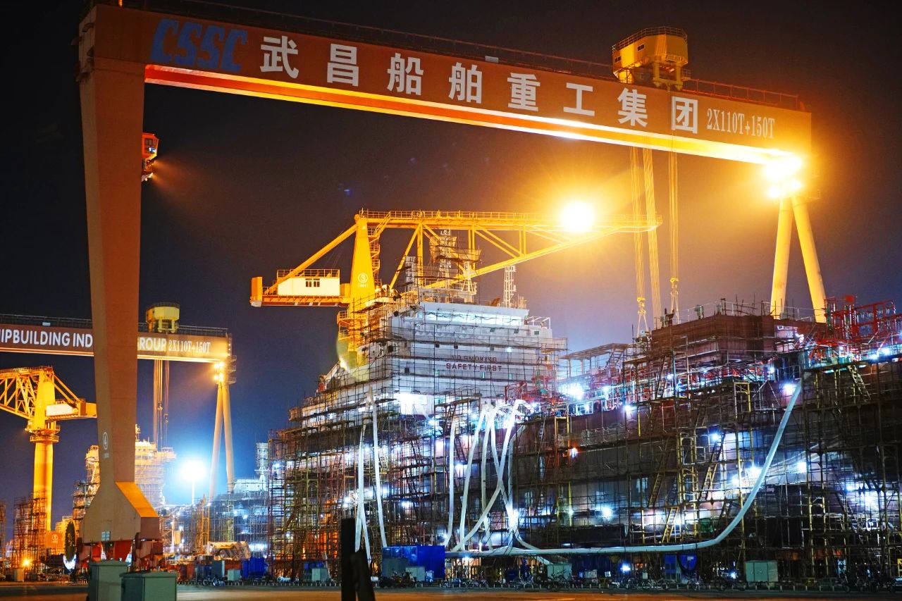 在武汉船机平台总装现场,华夏金租神大平台配套的1200吨起重机正在安装,大件吊装各项准备工作繁琐,一切就绪时,天已经黑了,现场一鼓作气开始吊装对接,展现了船舶人只争朝夕、不负韶华、忘我工作精神风貌。