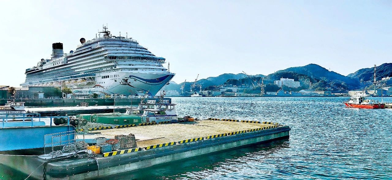 中国首艘国产大型邮轮“爱达·魔都号”与曾经建造过邮轮的日本三菱重工船厂隔江相望。