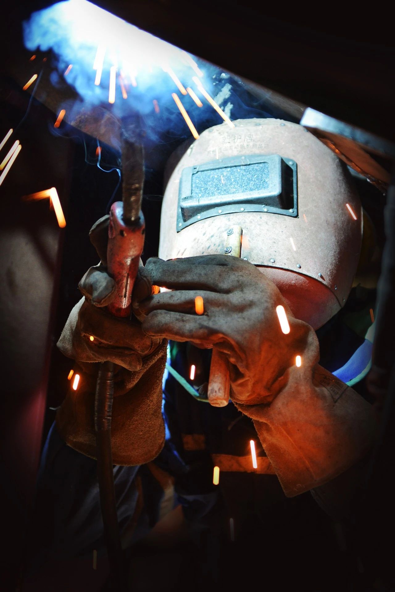 电焊工,就文冲修造最美的一线工人,他们从头到脚“全副武装”,一副墨镜,一个面罩,一套包裹的严严实实的工作服是他们的色调。此起彼伏吱吱作响的烧焊声,黄红蓝色的焊花,伴着刺眼的弧光,如喷泉一般是他们奏响的乐章。