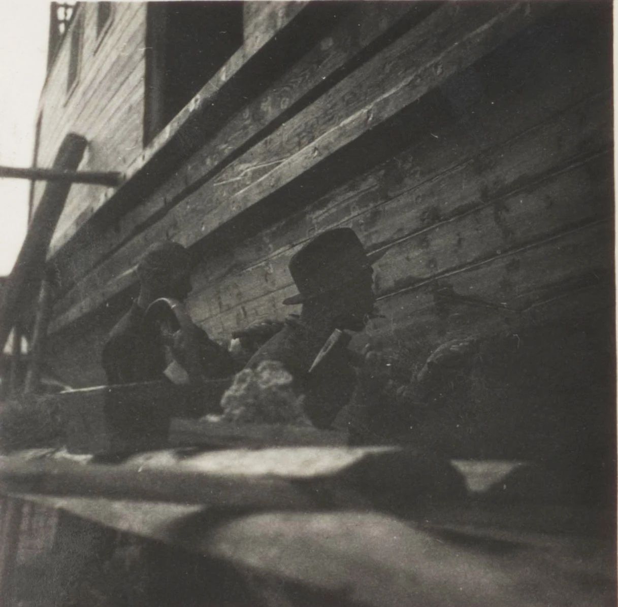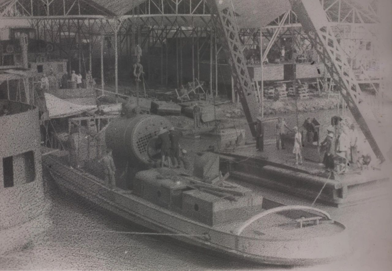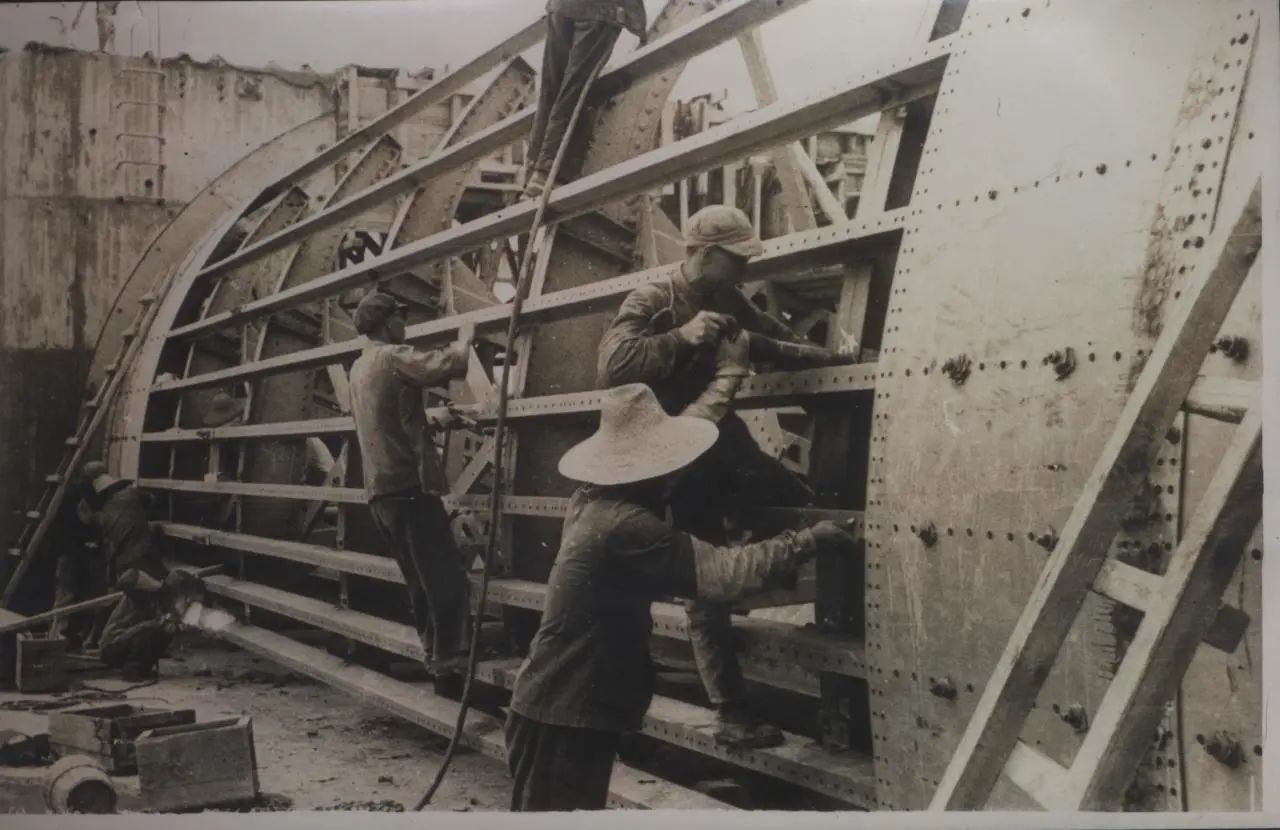 1934年武汉,上世纪30年代,武昌造船成立之初,工人们以手工作业“敲敲打打”形式开展修造船业务。修造的船只大多为100~300吨、钢肋骨与木壳结构,仅有少量是钢铆接船体。建造的船只只能在长江上航行跑跑运输。为了生存和救国,船厂还建造一些农用机械器具、枪支,以辅助民生、支援抗日。